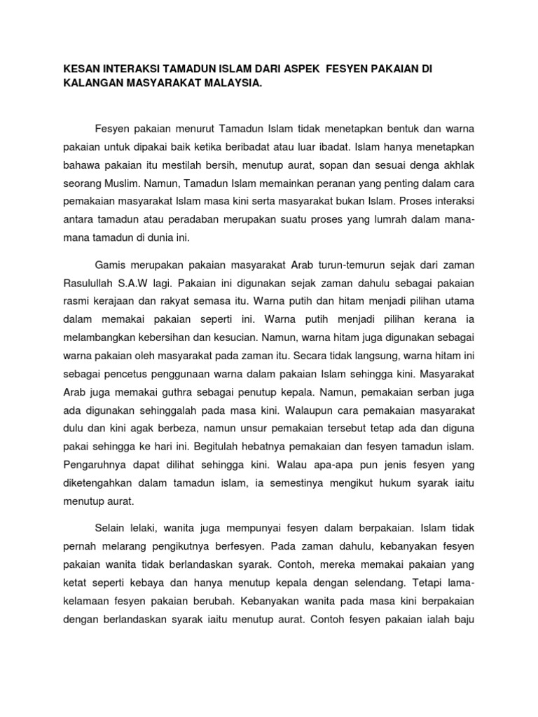 Kesan Interaksi Tamadun Islam Dari Aspek Fesyen Pakaian Di Kalangan Masyarakat Malaysia